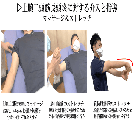 理学療法で行う場合は“二頭筋”ですので上腕二頭筋の長頭と短頭の筋間に指を入れそれぞれマッサージを行うことも大切です。
