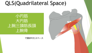 QLSは”Quadrilateral Space”の略でスライドの通り”小円筋””大円筋””上腕三頭筋長頭””上腕骨”で囲まれた間隙のことを言います。臨床では、オーバーヘッドスポーツ選手の肩関節の疼痛の原因として多くみられています。