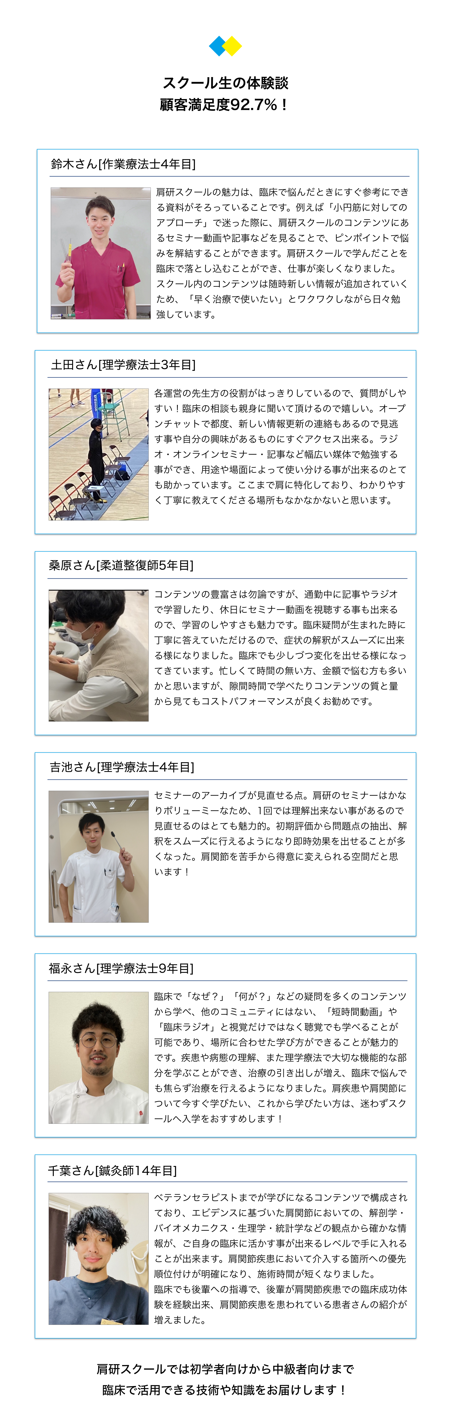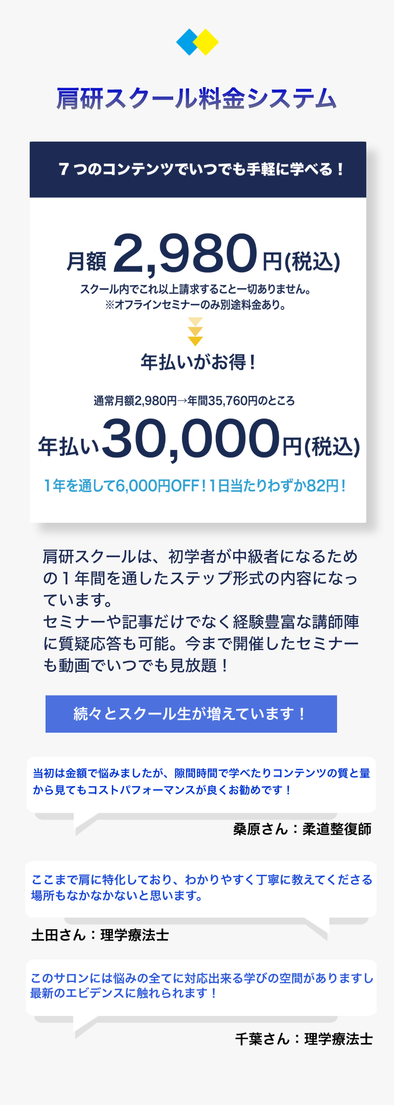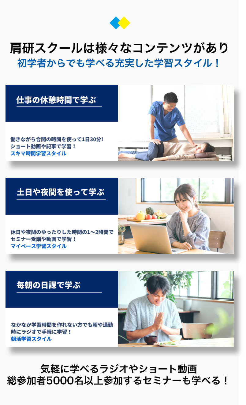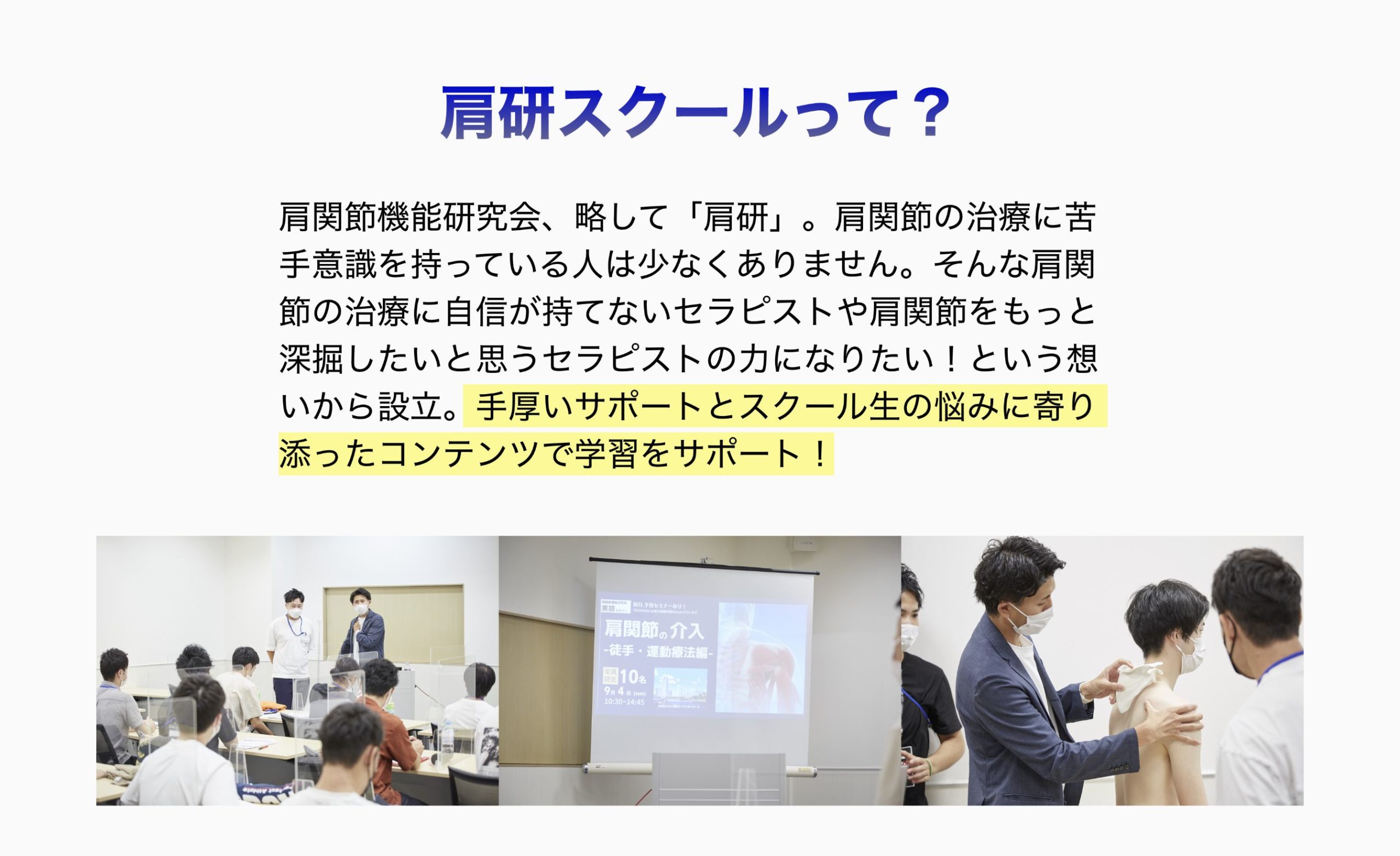 「セミナーを受けるだけ」であればそれでいいと思います。しかし、セミナーの内容を臨床で最大限に活かすのであれば常に学ぶ環境が必要です。肩研スクールではスクール生限定のオープンチャット(LINE)があり、更新するコンテンツをご案内するので学ぶ機会が多くなるようにしています。