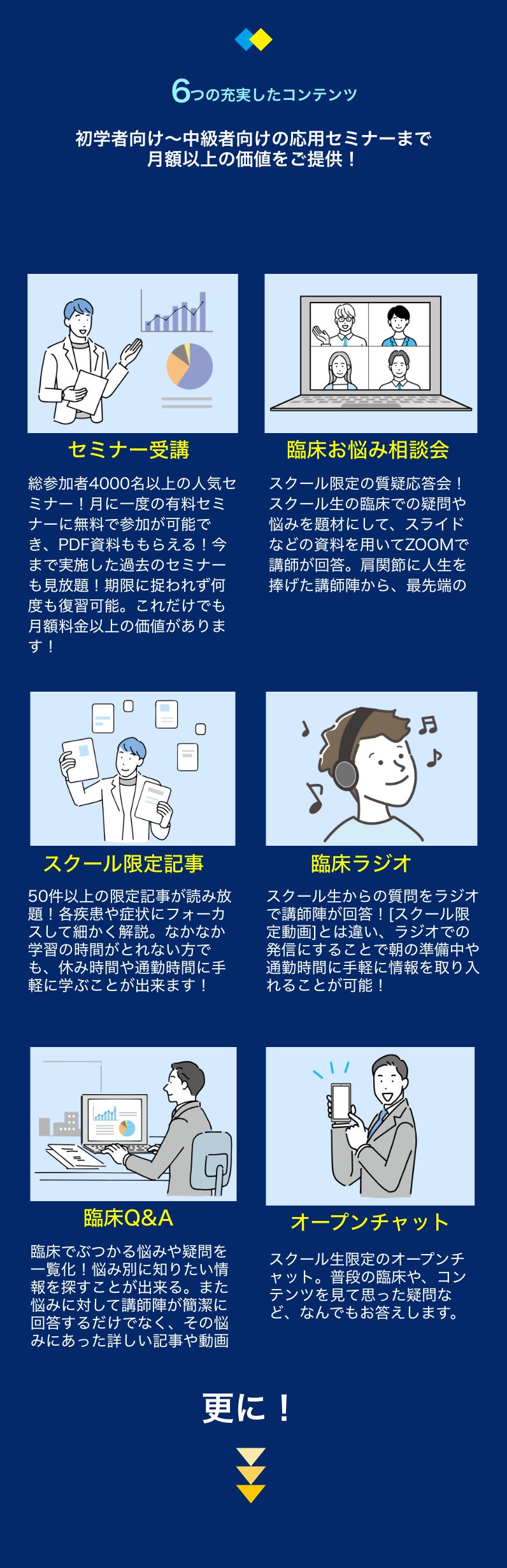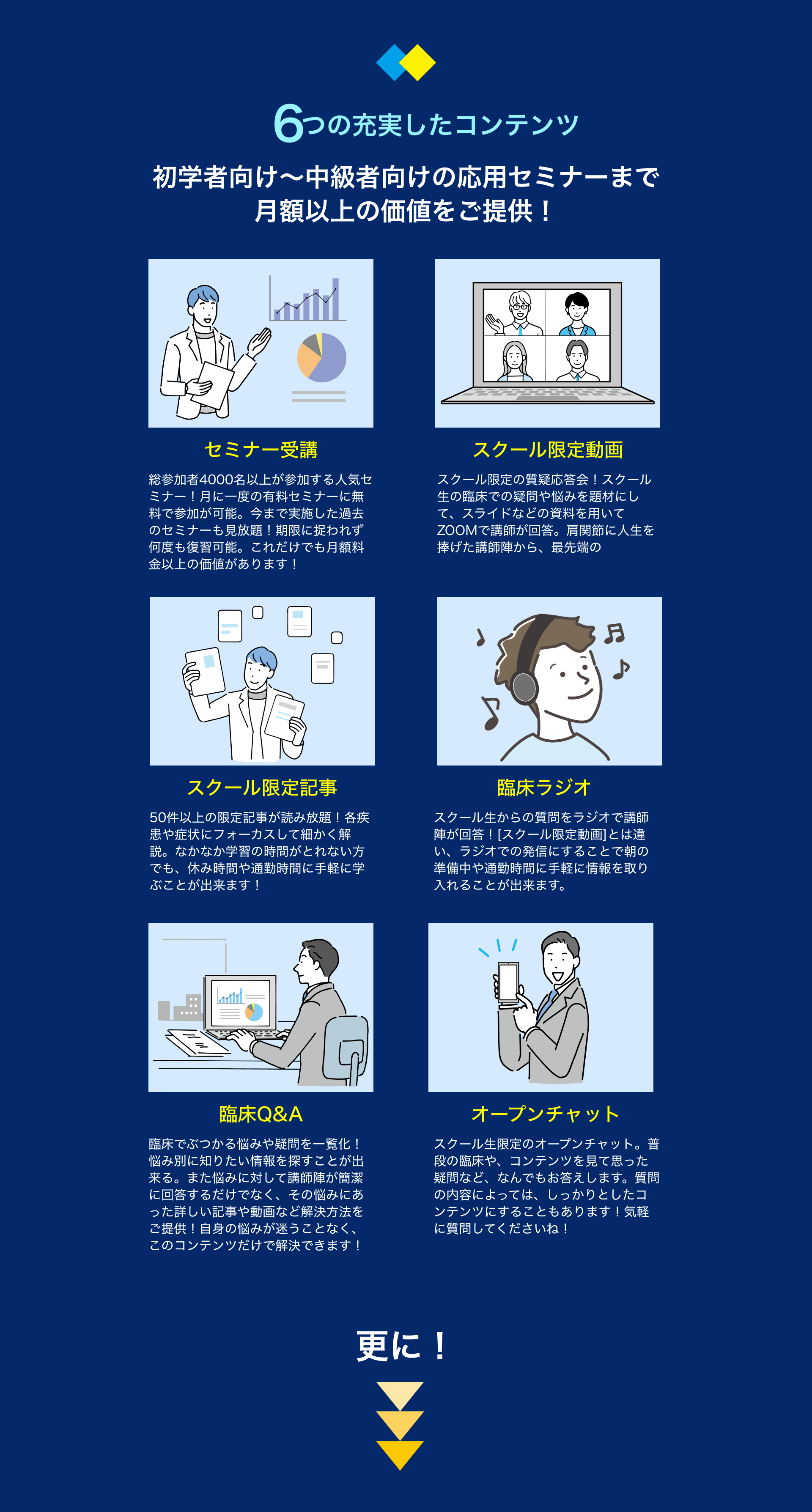 ■臨床Q-A:1-2/週■オンラインセミナー:1/月■限定記事:1/月■臨床ラジオ:隔週