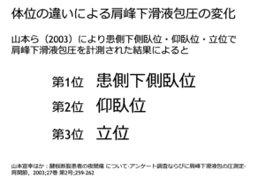 側臥位では、立位よりも肩峰下圧は上昇すると報告されています。