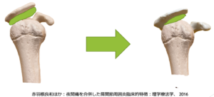 また、癒着によって肩甲上腕関節が求心位を取ることが出来ずに肩峰下圧上昇につながることも予測できます。